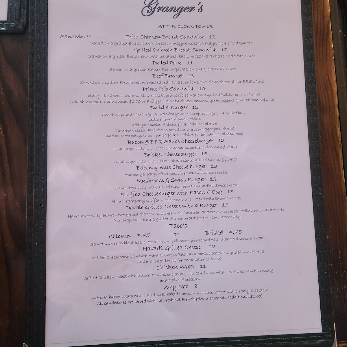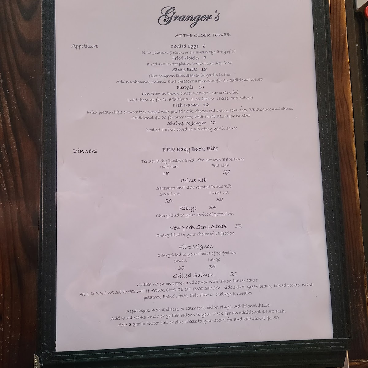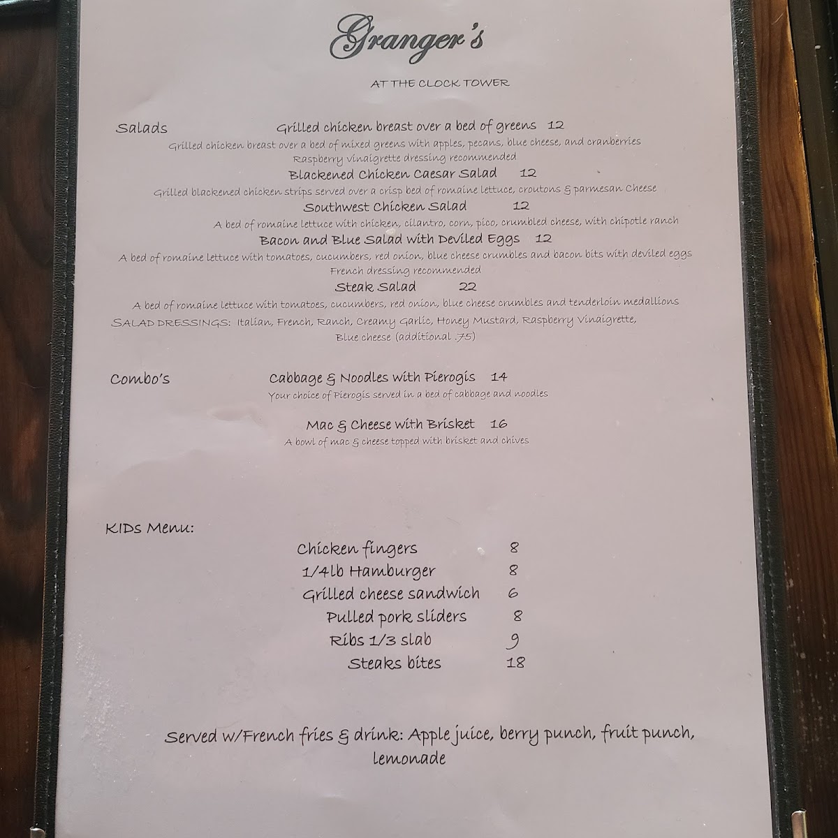 The menu at Granger’s At the Clocktower offers a straightforward, approachable selection that balances hearty comfort with casual dining. It’s a place where familiar favorites like ribs with cabbage and noodles or a BBQ bacon cheeseburger make for satisfying meals, whether you're stopping in for a relaxed dinner or enjoying a casual night out with friends.