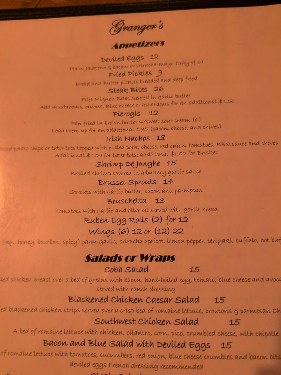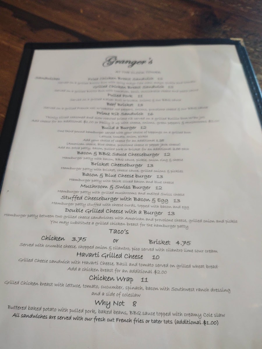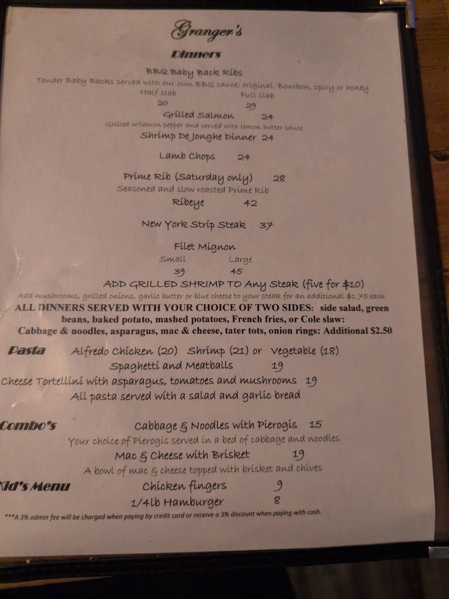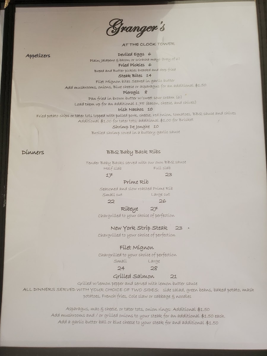 The menu at Granger’s At the Clocktower offers a straightforward, approachable selection that balances hearty comfort with casual dining. It’s a place where familiar favorites like ribs with cabbage and noodles or a BBQ bacon cheeseburger make for satisfying meals, whether you're stopping in for a relaxed dinner or enjoying a casual night out with friends.