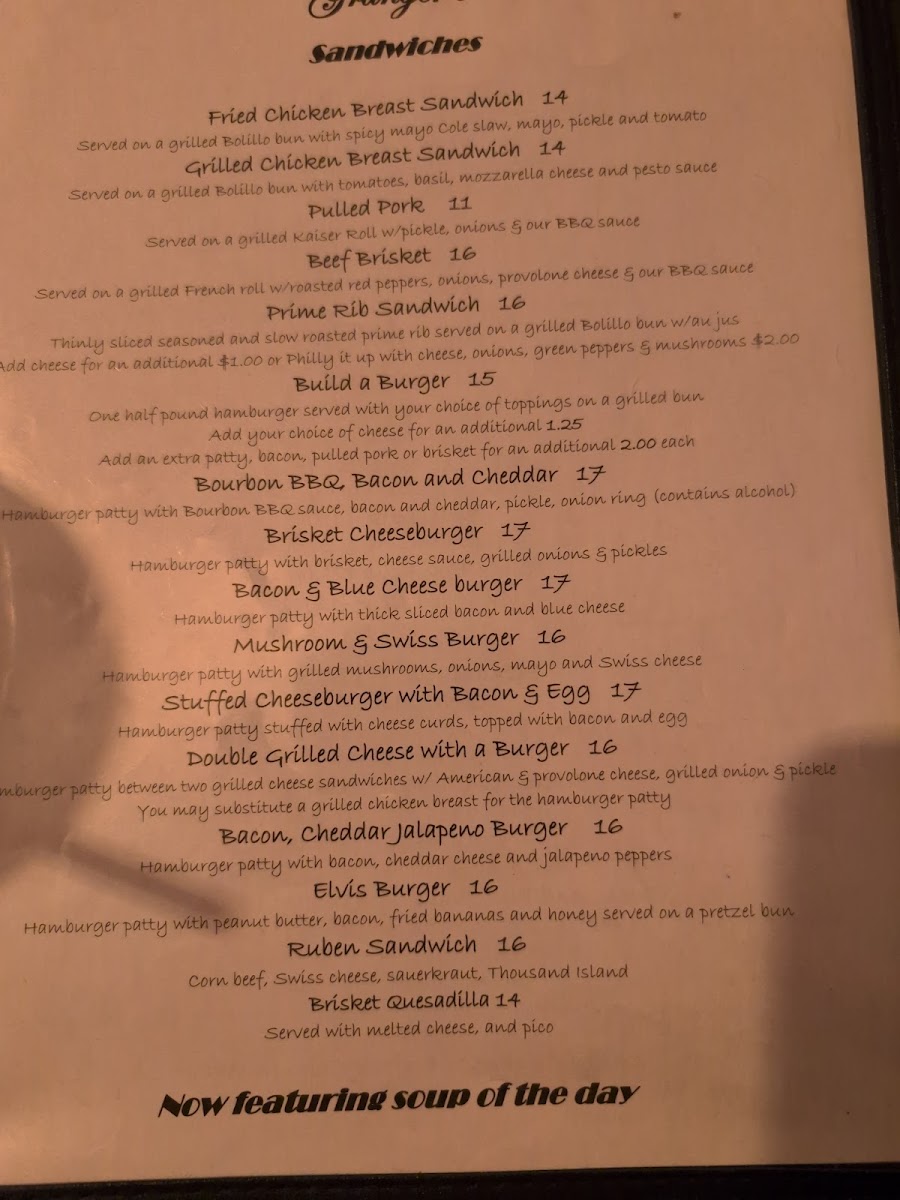 Alongside fulfilling mains such as prime rib with sides and rib eye steak, you’ll find shareable bites like Irish nachos and brisket sandwiches, which complement the easygoing, cozy atmosphere. The menu also features thoughtful sides — from brussel sprouts and onion rings to mac and cheese with brisket — adding comforting touches to any meal.